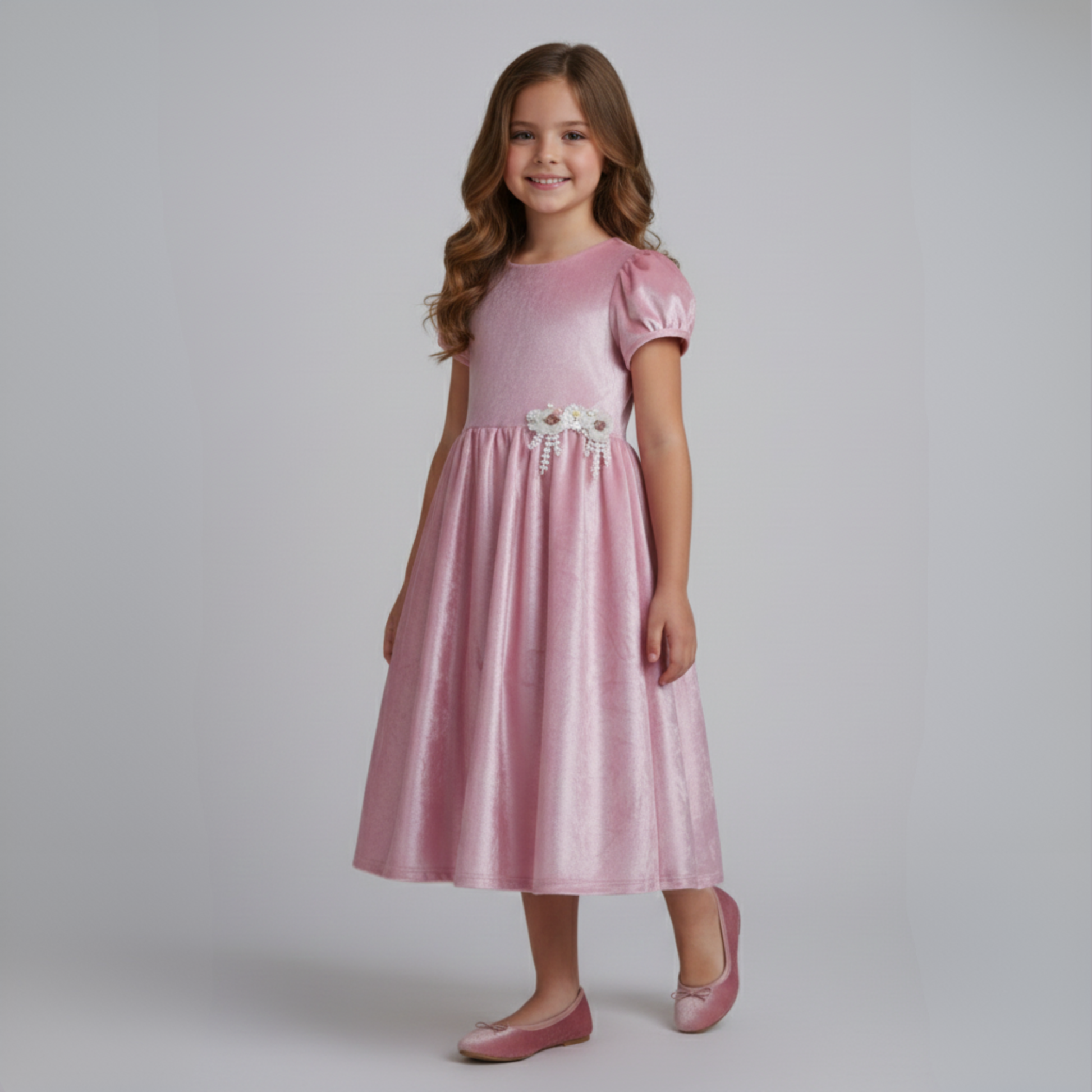 LUX FLOWER | Rose Velvet Dress with Floral Waist Embellishment